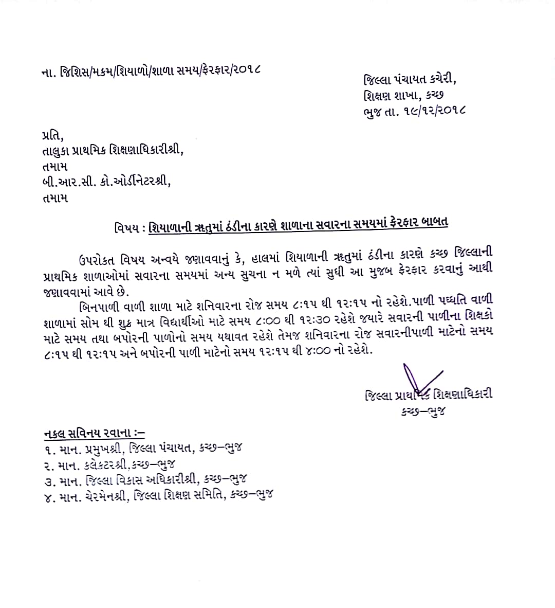 KUTCH- THANDI NE KARNE SHALA SAMAY FERFAR BABAT PARIPATRA DATE- 19-12-2018.
